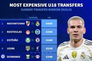 德转列今夏U18最贵转会榜:马斯坦托诺居首,埃斯特旺&莱奥尼在列