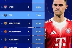 体育资讯11月5日讯 在本轮欧冠,拜仁2-1击败巴黎,德转也统计了拜仁在近20个赛季欧冠对阵胜率最高的对手(至少5次对阵),具体如下: